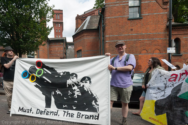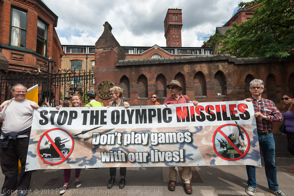The 'Stop the Olympic Missiles' banner outside the Bow Quarter; soldiers watch from the top of the tower