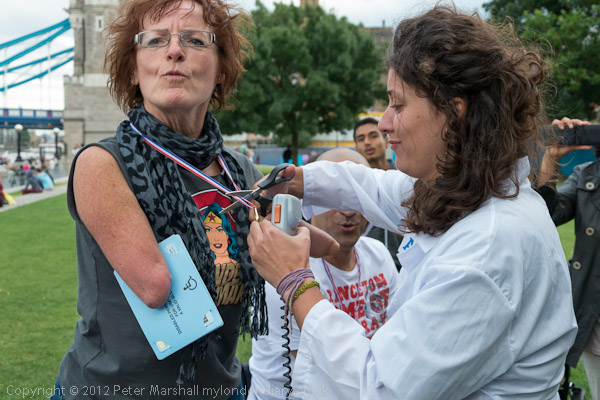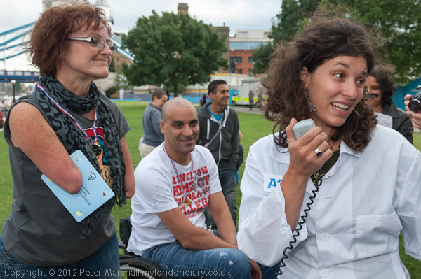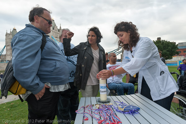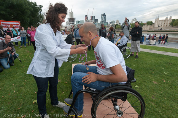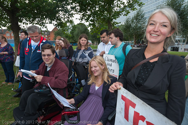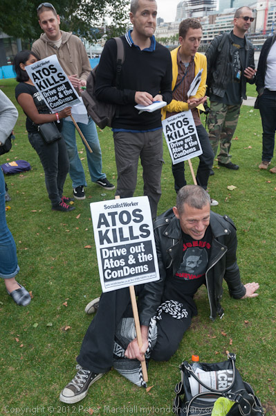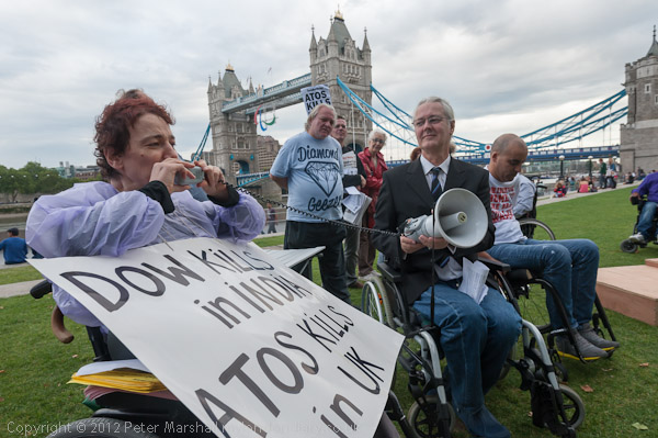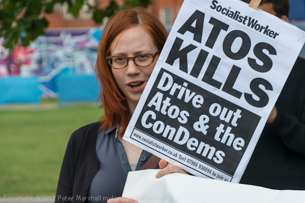 Clare Glasman with a placard 'Dow Kills in India, Atos Kills in UK'