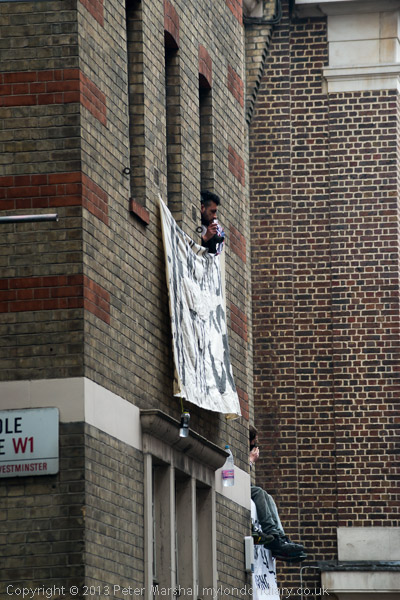 The police with riot shields were opposite the front of the building. Inside were a fairly small number of peaceful protesters, including some children