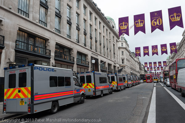 Police vans on Regent St. Other streets around all had police vans, and they also had 2 double-decker buses