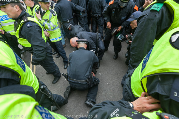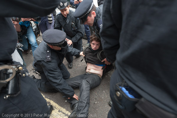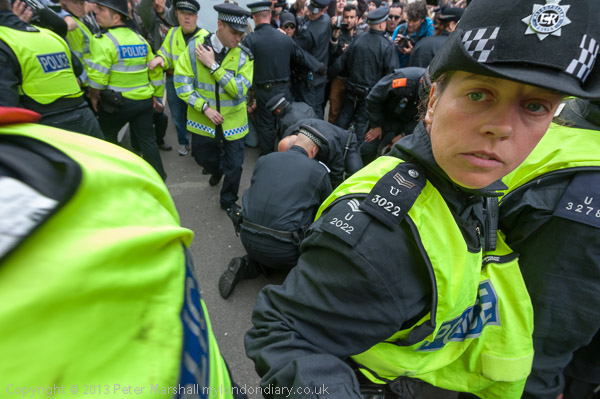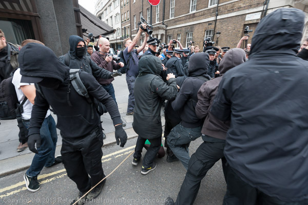 Black-clad protesters and police on a Mayfair corner where another arrest is taking place