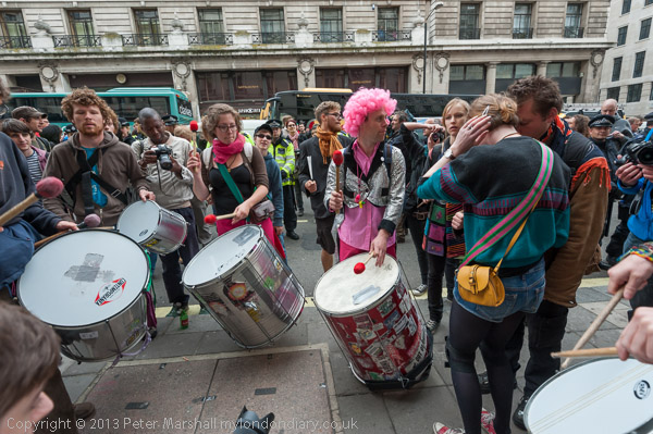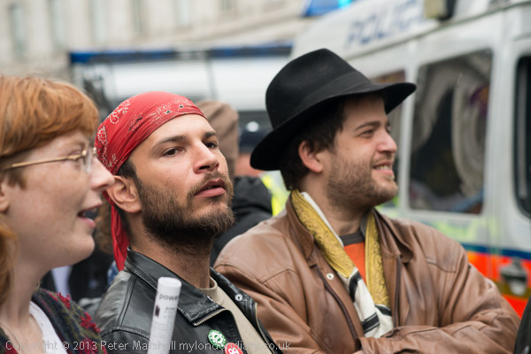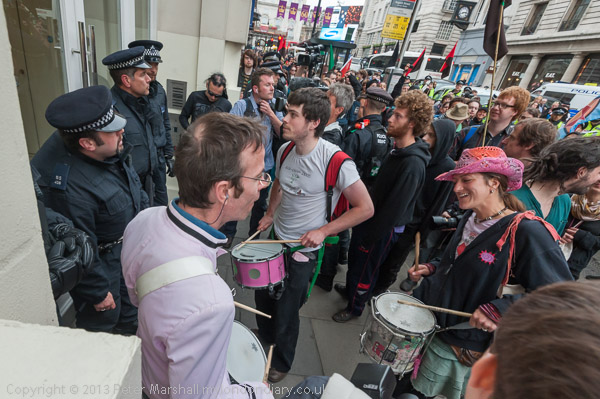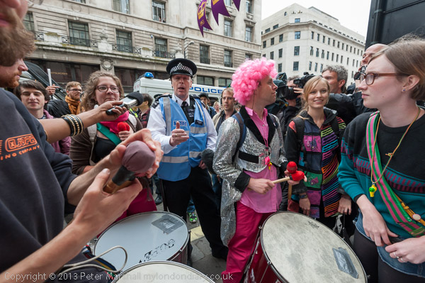 A police officer comes to tell the protesters they need a licence to play music on the street in Westminster