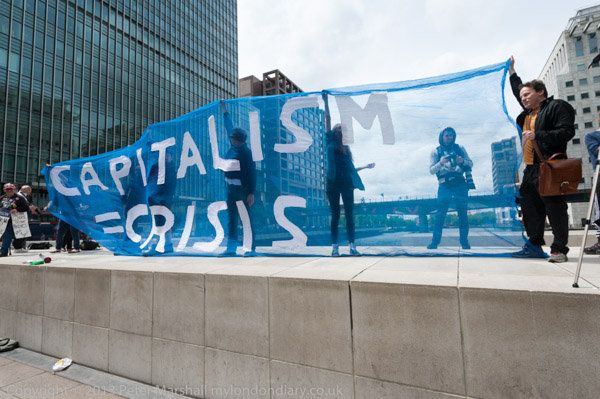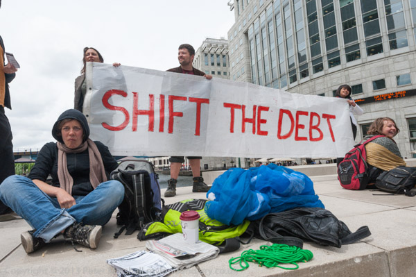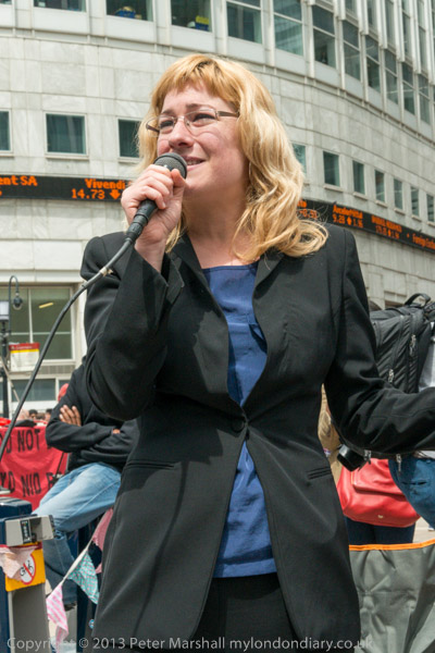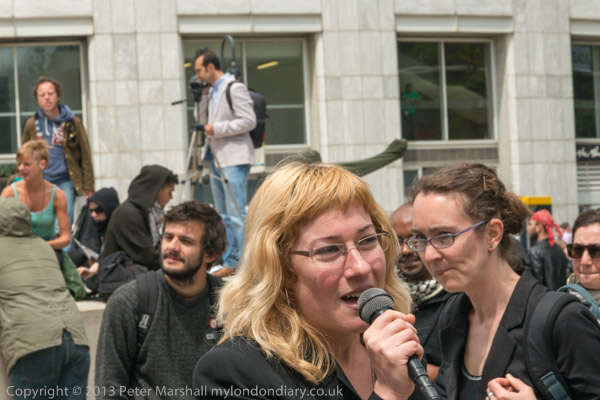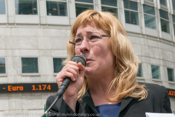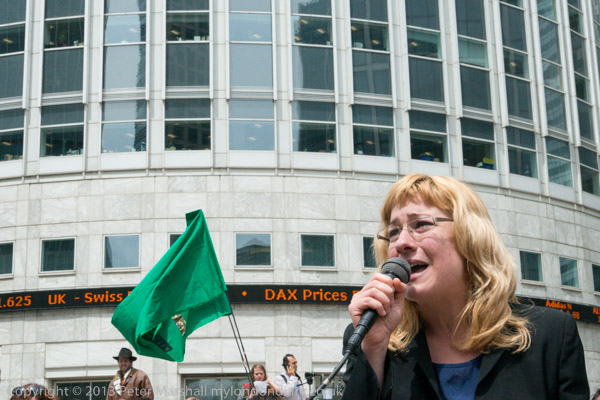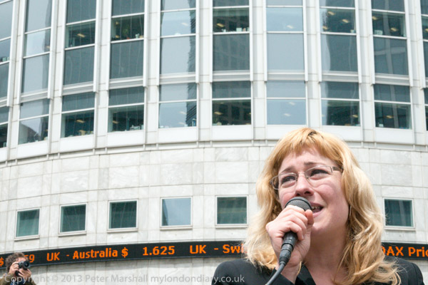 Behind the speaker talking about 'No Dash for Gas' the display of exchange rates and stock prices