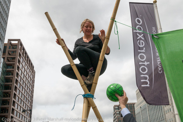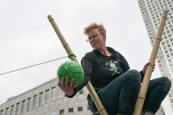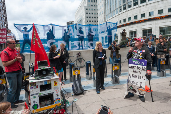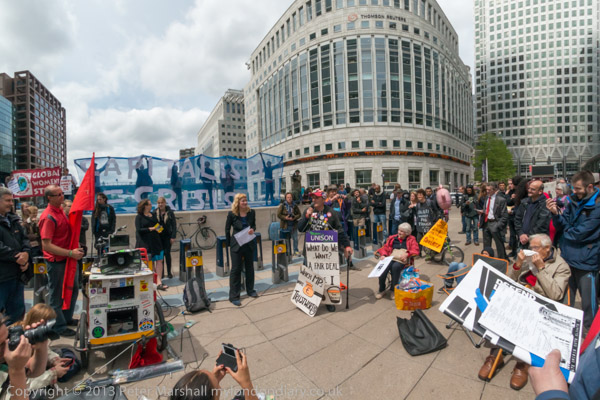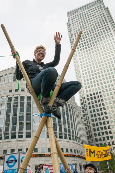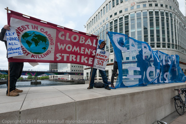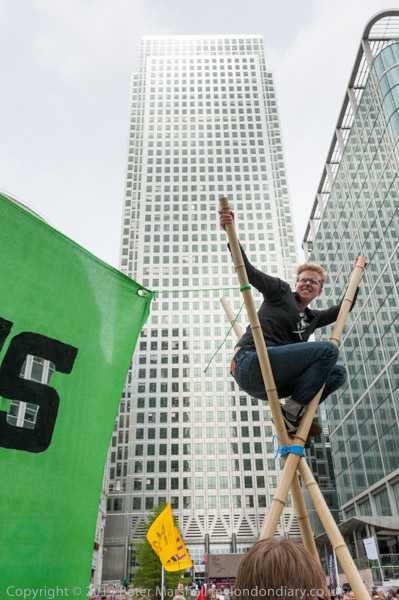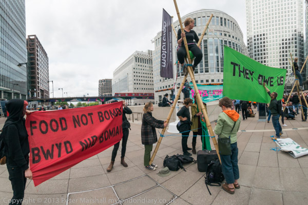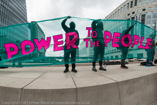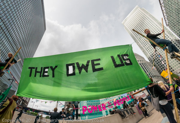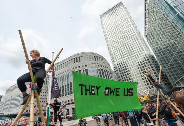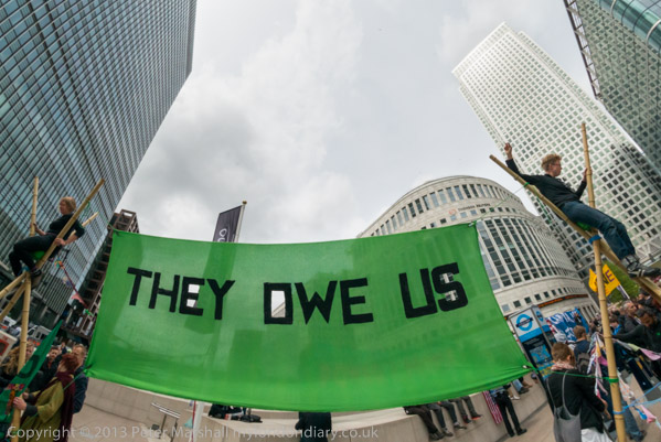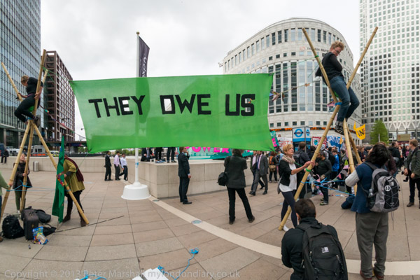 The tripods with the main banner - 'They Owe Us' and Canary Wharf tower