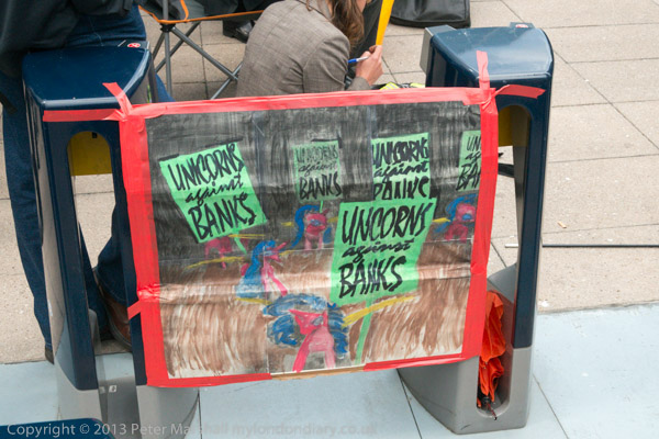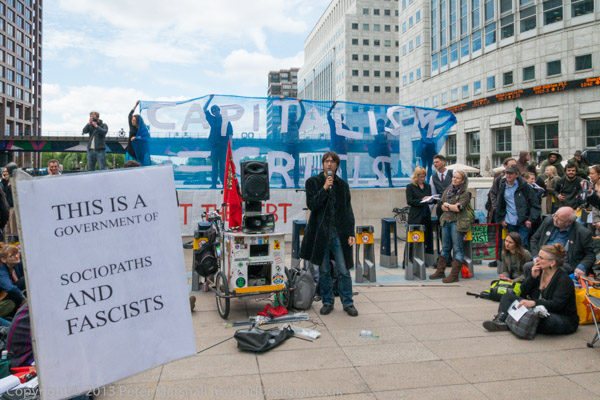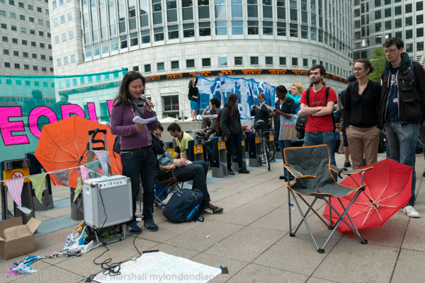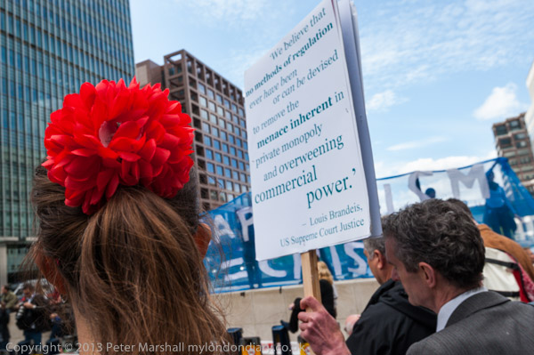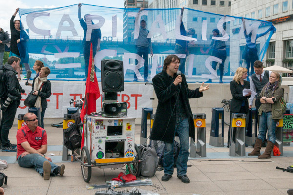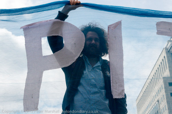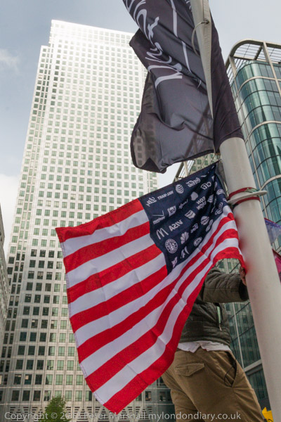'G8's New Alliance feeding Africa to the Corporations' and the corporate US flag in front of Canary Wharf