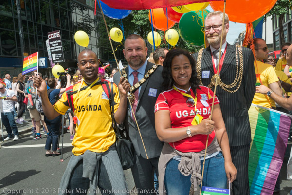 Uganda t-shirts pose with the Mayors at the front of the protest