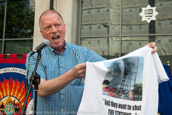 Matt Wrack holds up one of the t-shirts showing a blazing tower block "And they want to shut FIRE STATIONS"