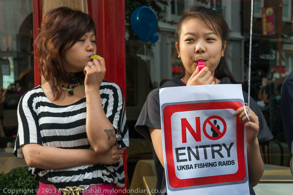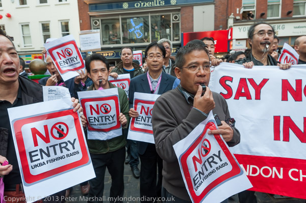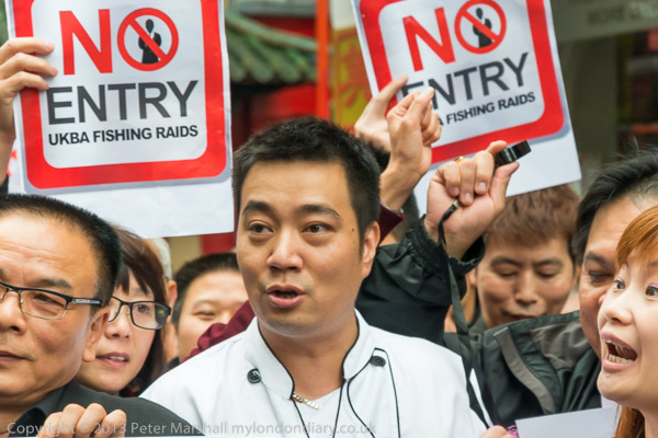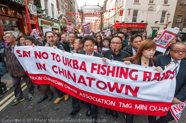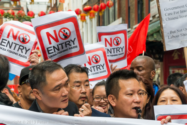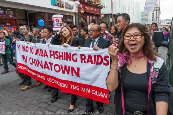 The banner reads 'Say No to UKBA Fishing Raids in Chinatown'