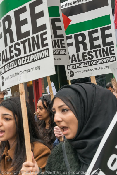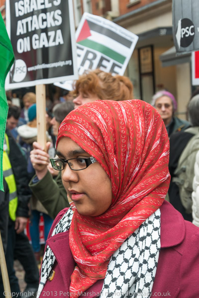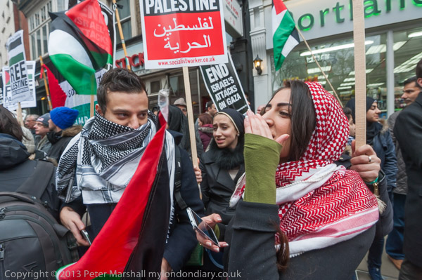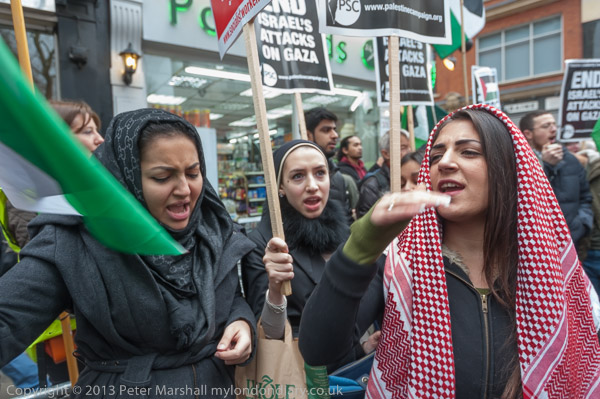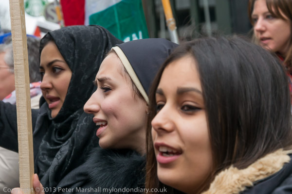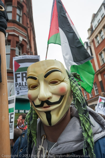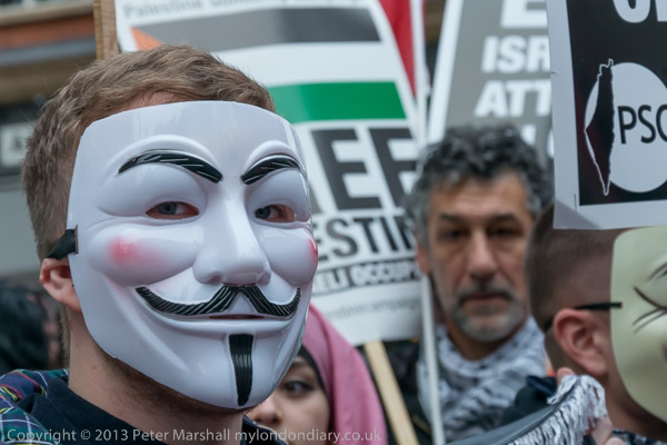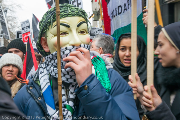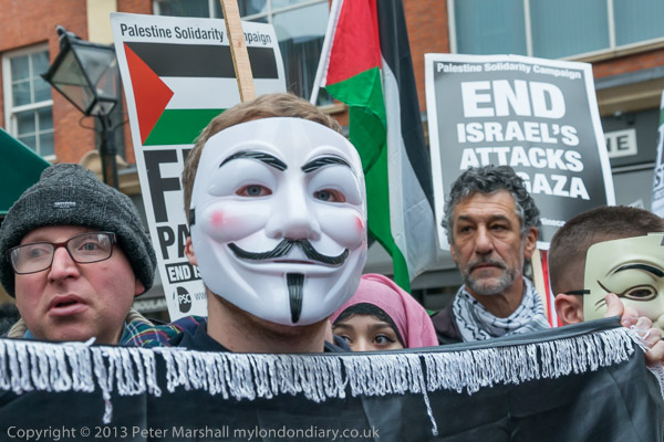 A few protested in Anonymous masks. Many wore Palestinian scarves, and there were many women in Muslim headscarves
