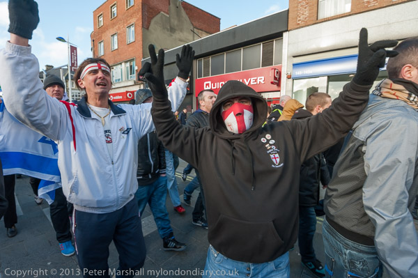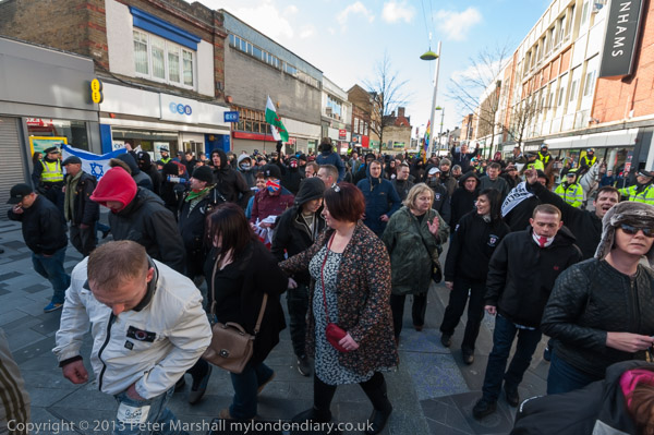 The EDL walk along the High Street after police have pushed back protesters and local people