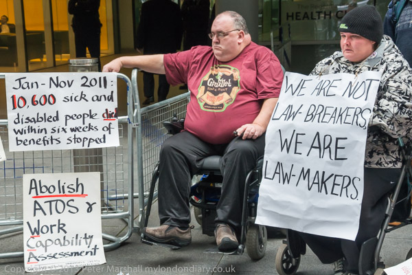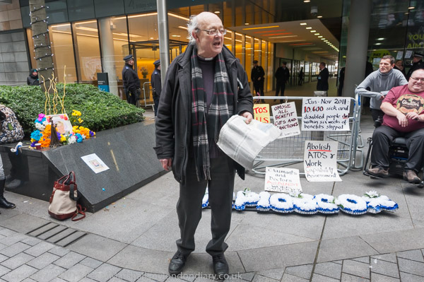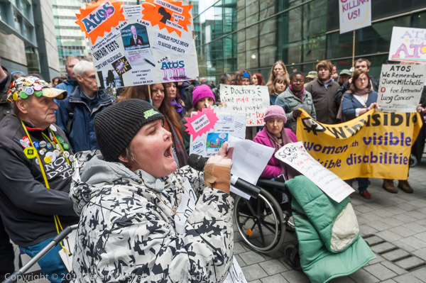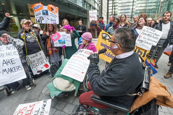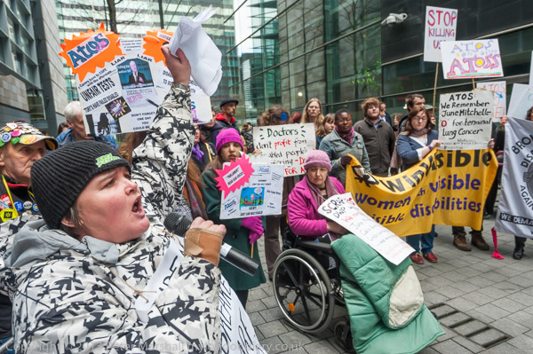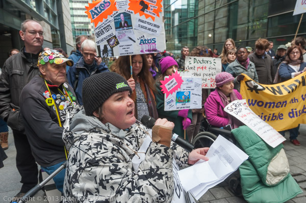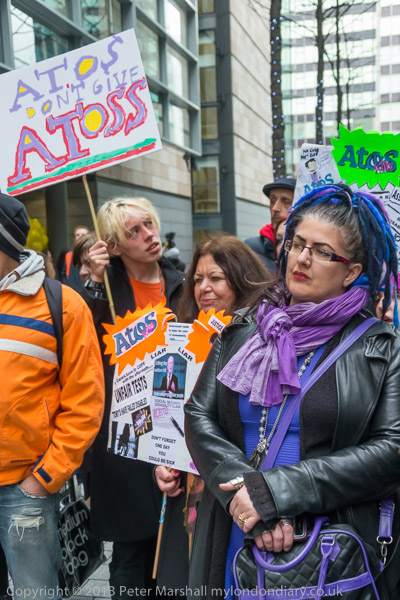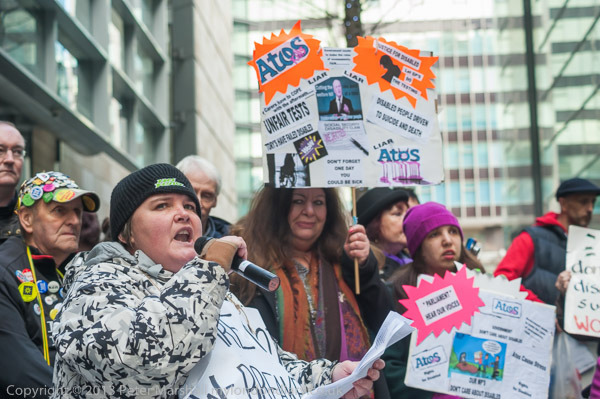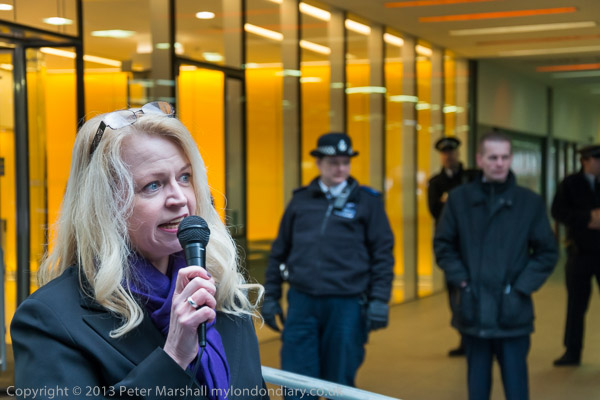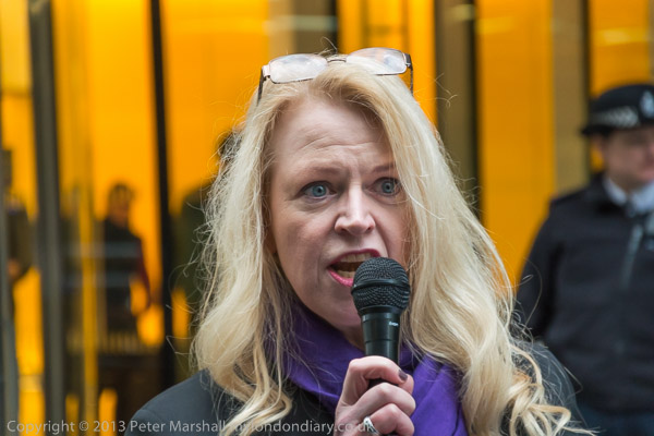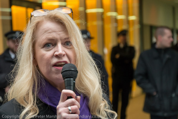 Paula Peters of DPAC speaking outside the Atos Offices in Triton Square