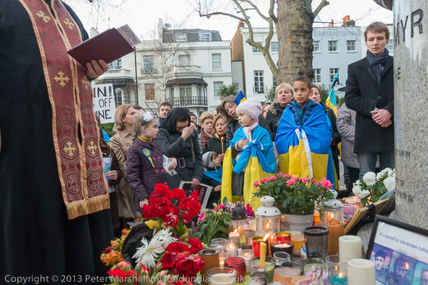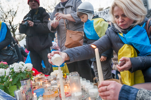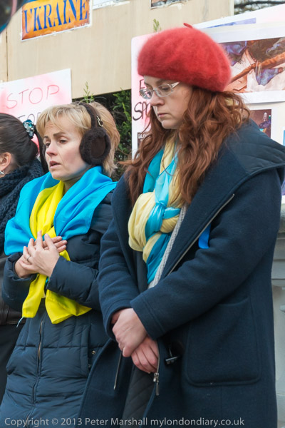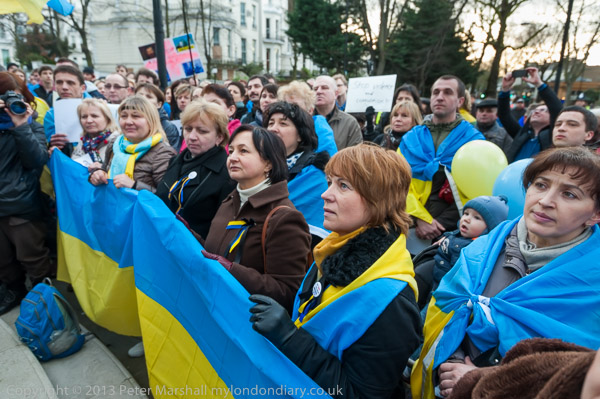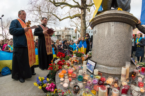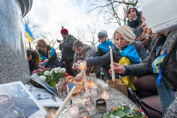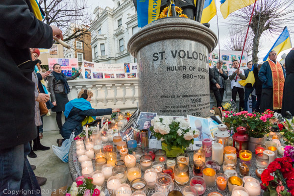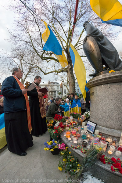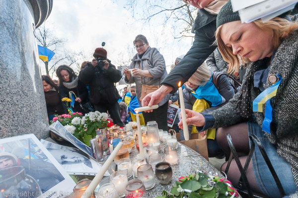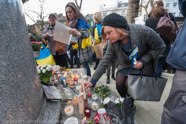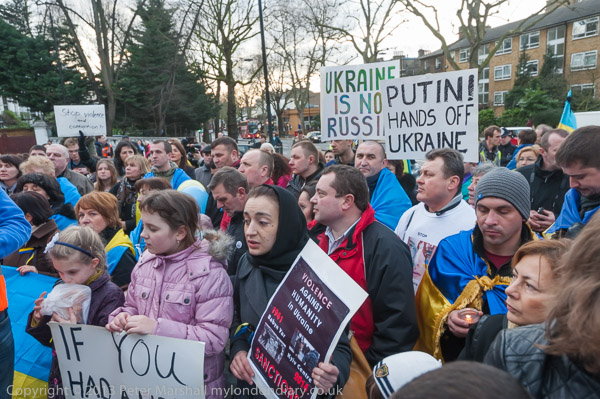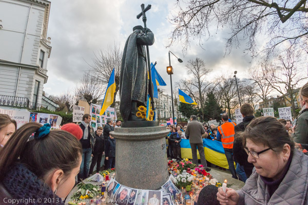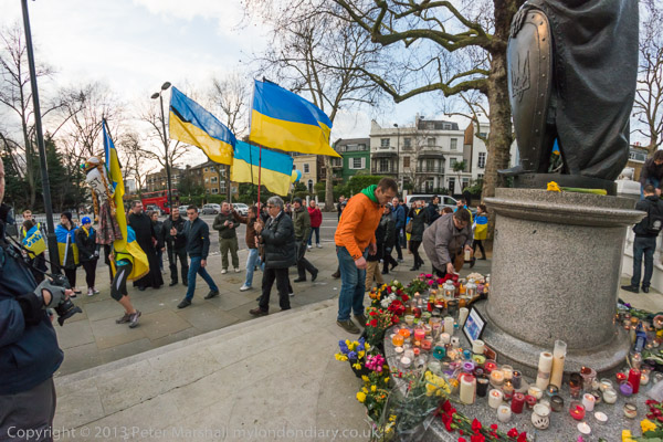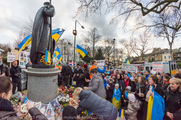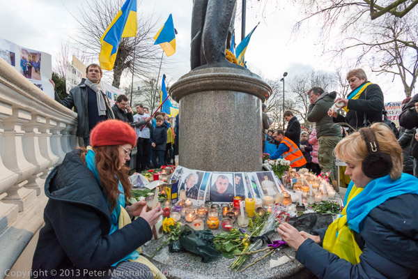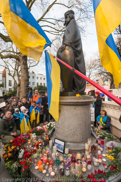 'Ukraine is Not Russia', 'Putin! Hands off Ukraine'. The crowd in front of the statue