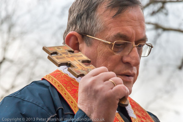 The priest holds up the cross