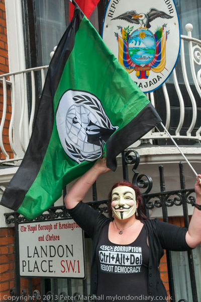 A woman in the '<Esc> CORRUPTION - Ctrl+Alt+Del - REBOOT DEMOCRACY'  t-shirt holds an Anonymous flage in front of the Embassy sign