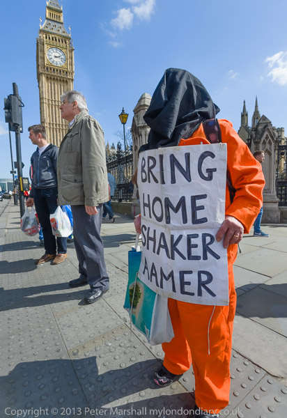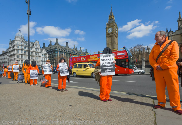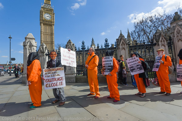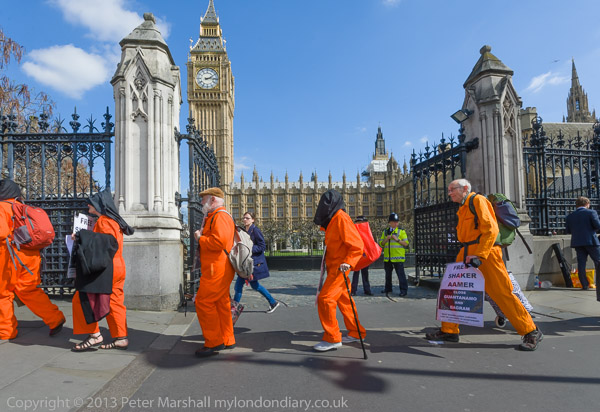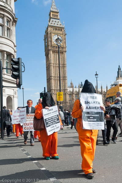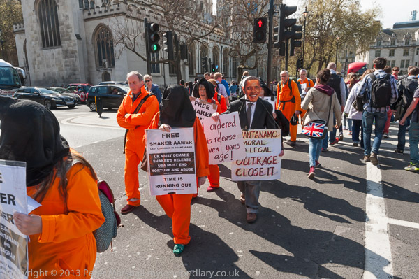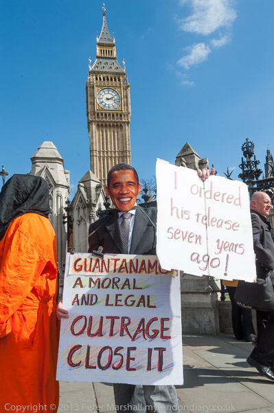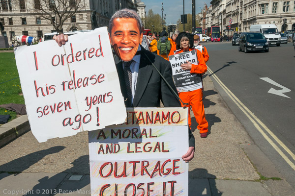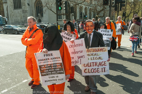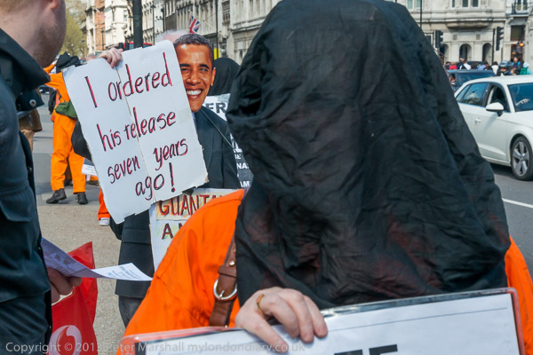 Protesters including one as President Obama get lined up to march to the Foreign Office