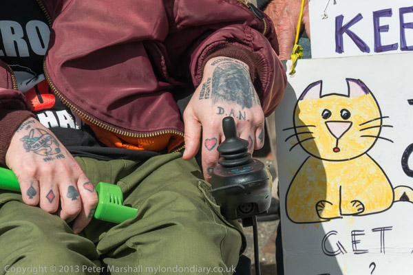 A disabled activist with tatooed hands, including for DAN - Disabled Activists Network