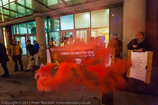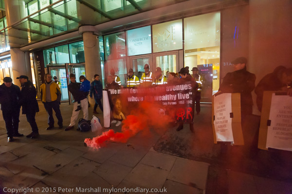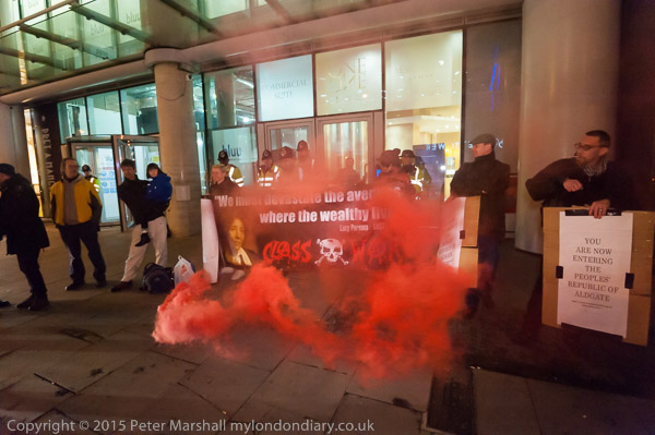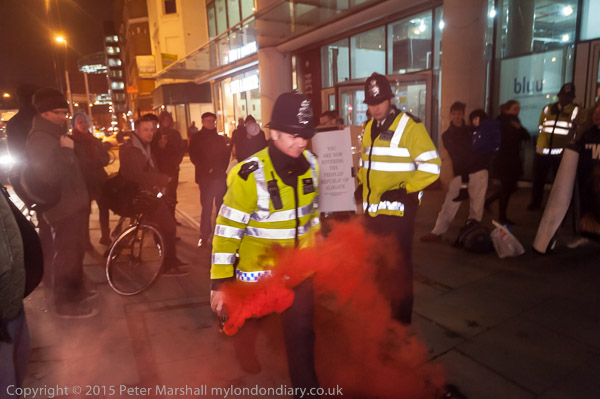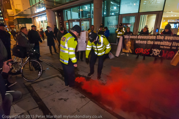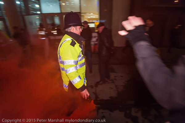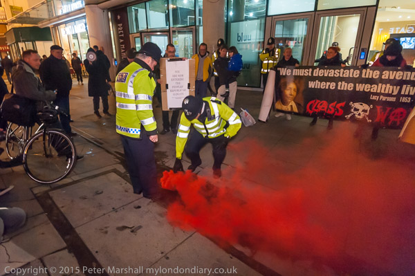 and into a bin on the corner where it continues to burn, now spilling its red smoke into the busy junction