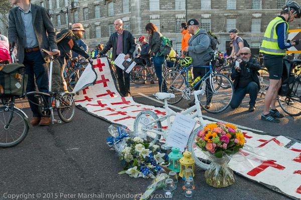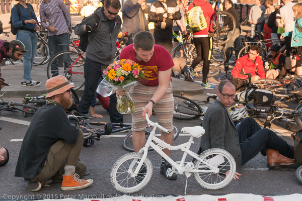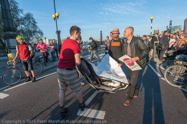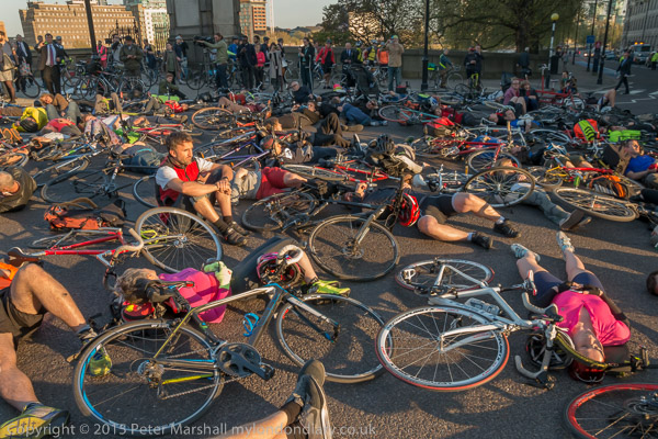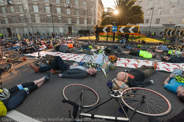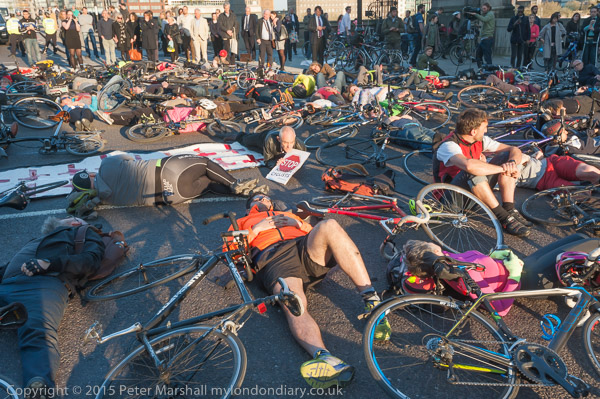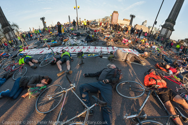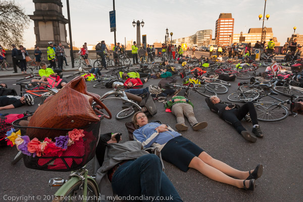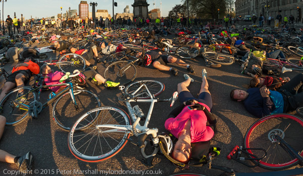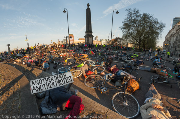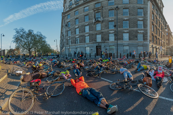The die-in stretched all around the roundabout where the bridge meets Millbank and Horseferry Rd