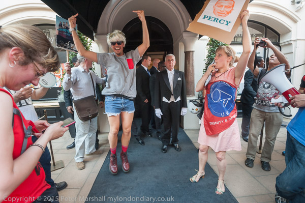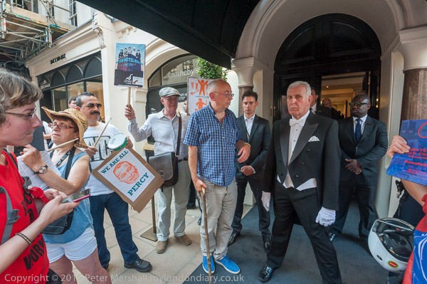 Class War entertain: Ian Bone approaches the doorman to pose with him for photographs