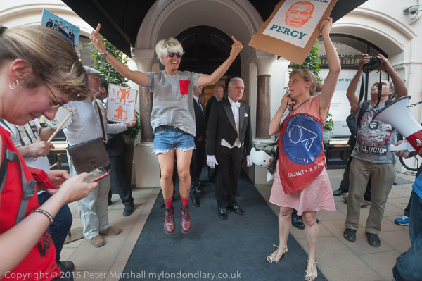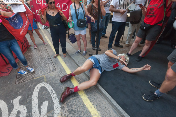 Adam Clifford from Class War dances on Sotheby's carpet which is on the pavement