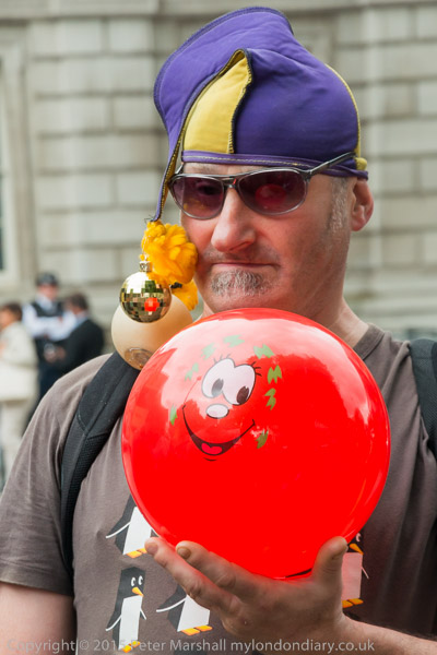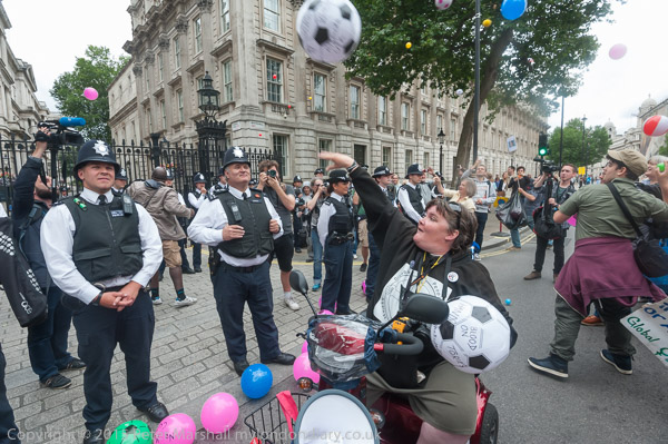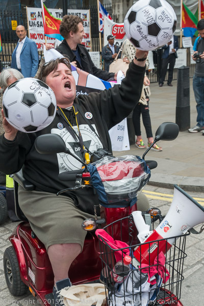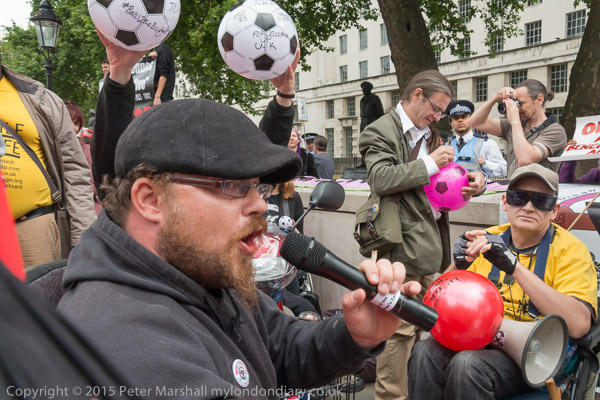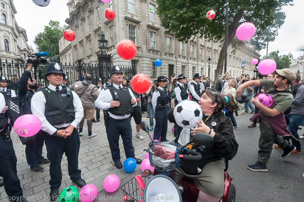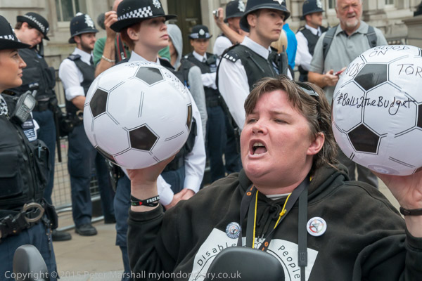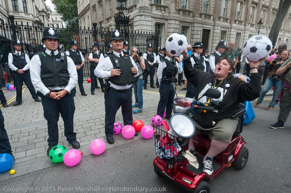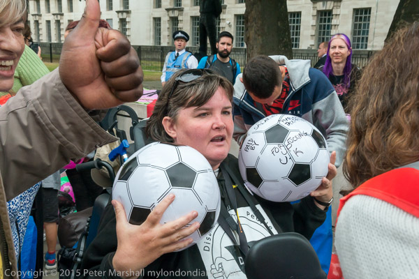 Paula Peters holds up two balls with messages for Osborne and Cameron