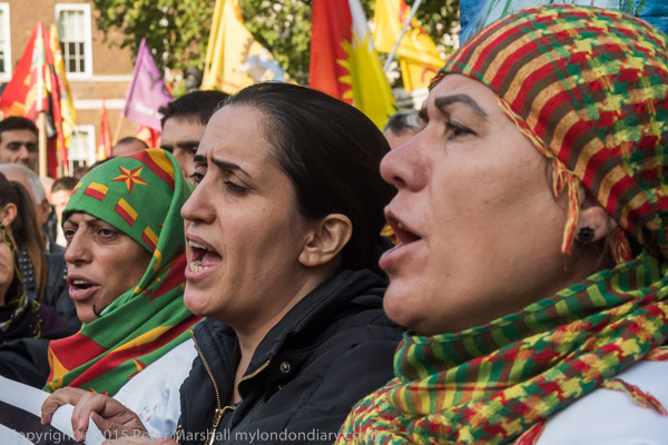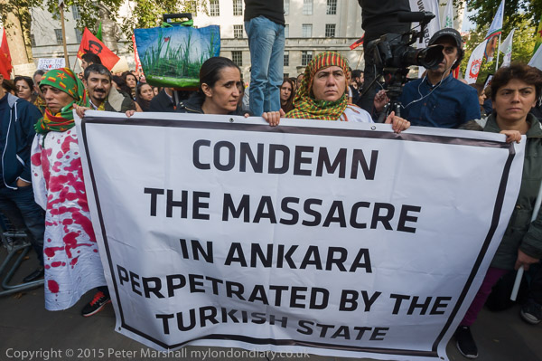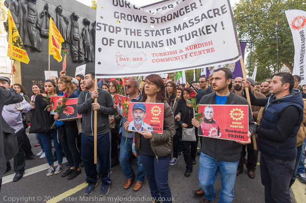 People march up Whitehall behind a Day-mer Banner hodling pictures of some of those killed in Ankara massacare