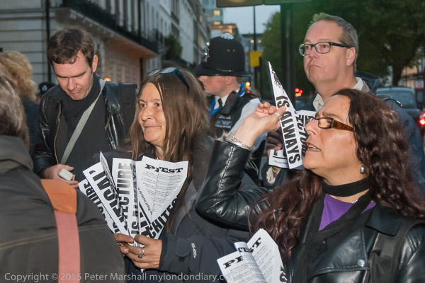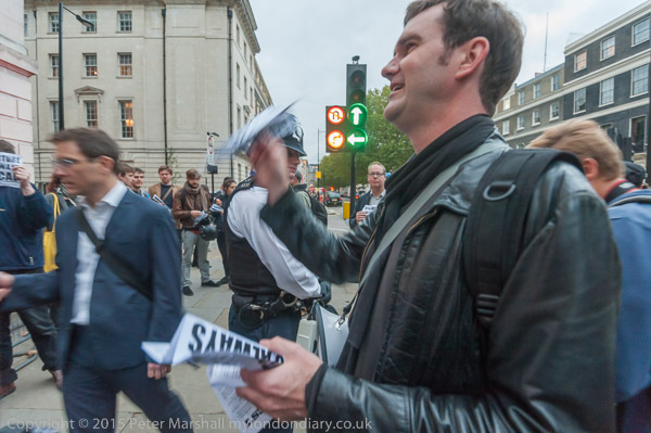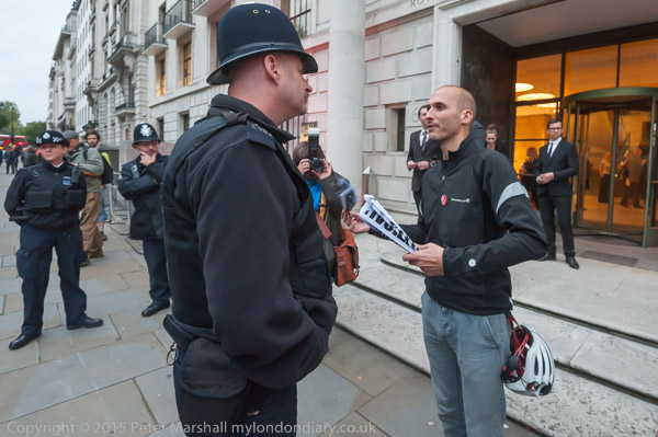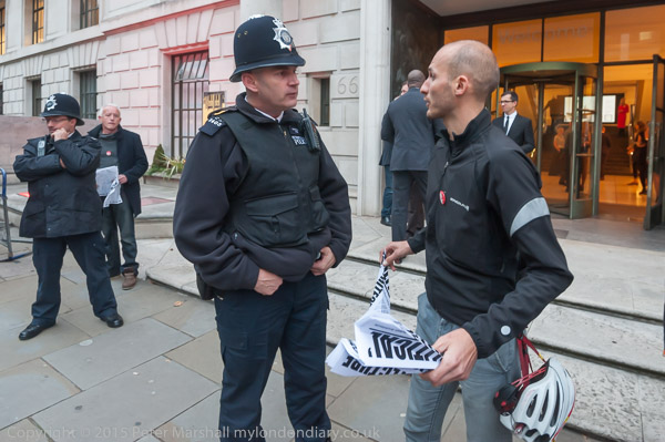 A police officer threatens one of the protesters who is handing out leaflets