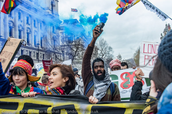 The Global Frontlines bloc paused briefly to protest outside Downing St