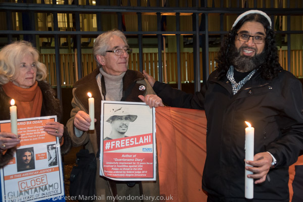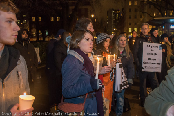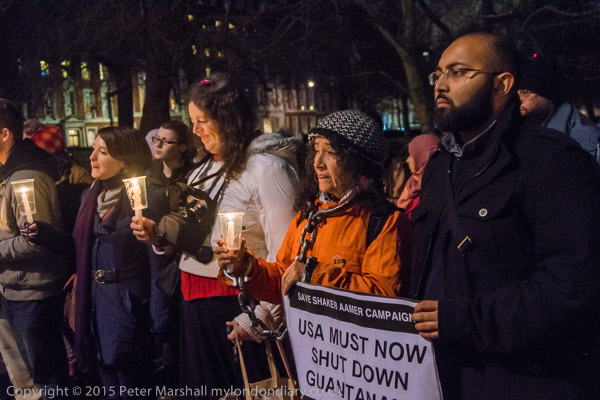 Peter Tatchell in the crowd holds a poster '14 years is enough. Close Guantanamo'