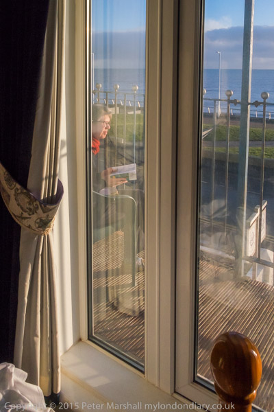 Linda reads on the balcony as I get dressed for breakfast