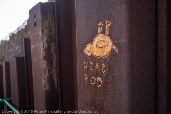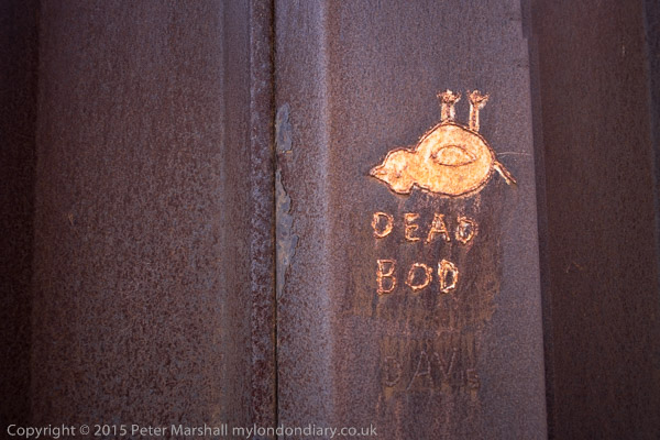 'Dead Bod' on piling beside a track down from a boat yard. The gates at the top were locked