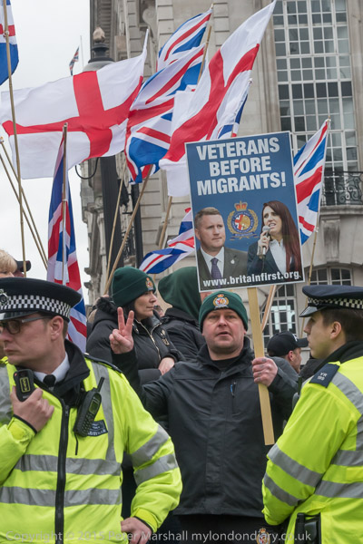 Police stop anti-fascists approaching the small Britain First ultra-right protest at Piccadilly Circus