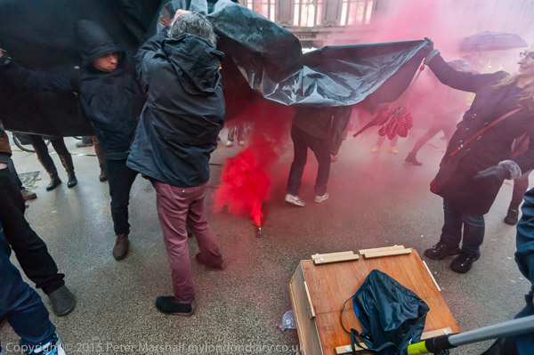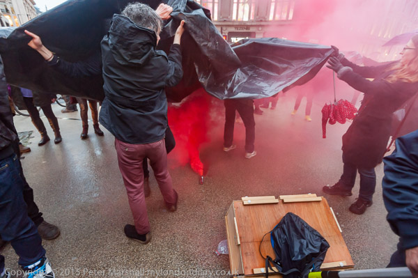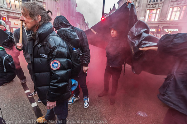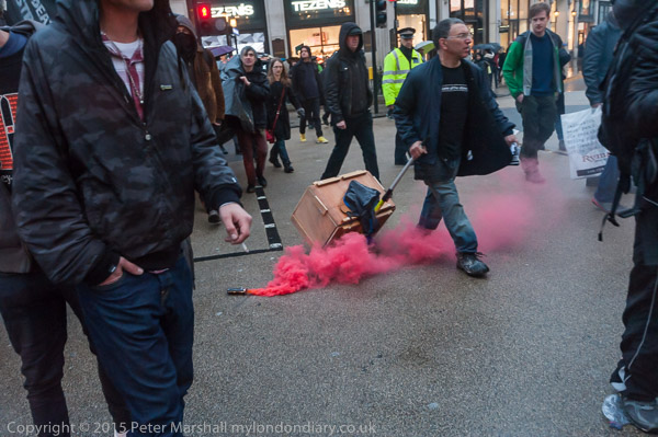 One of the protesters throws down a red smoke flare in the middle of Oxford Circus