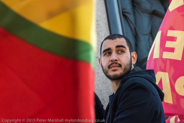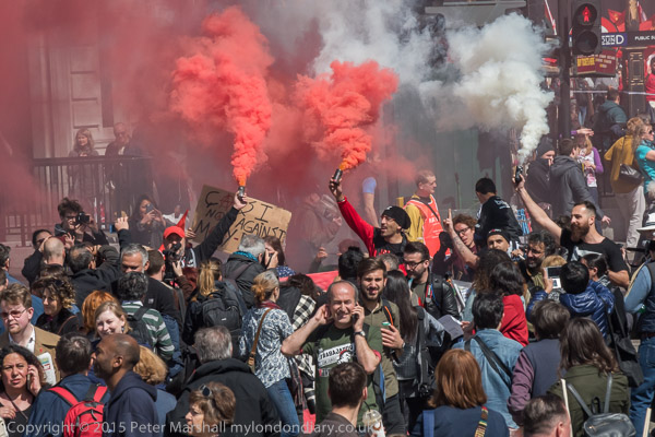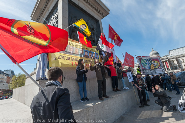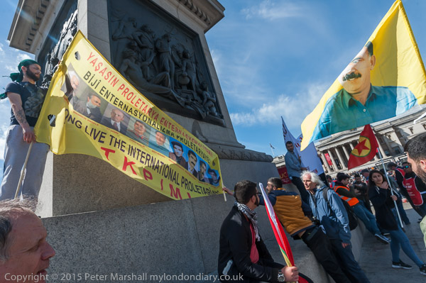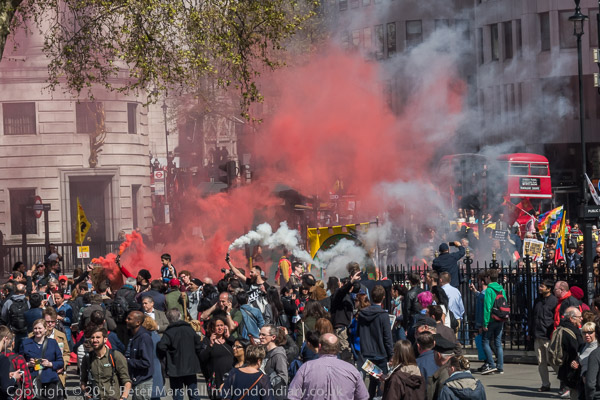 More people climb on to the plinth with their banners. They think the steward is unhinged and unfraternal and