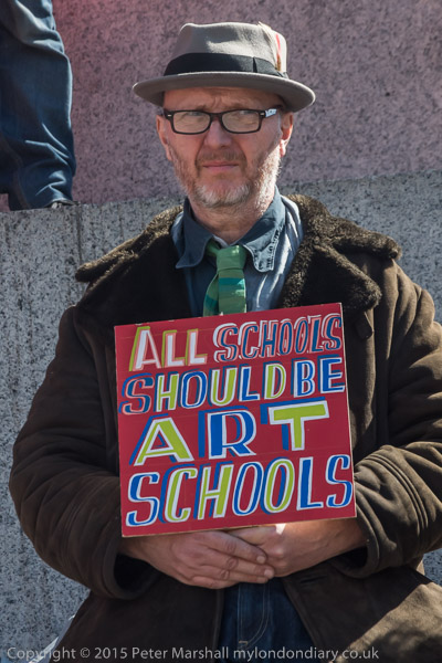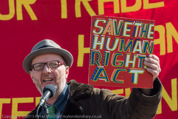 Bob & Roberta Smith holds up a painting 'Save the Human Rights Act'