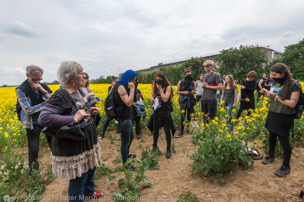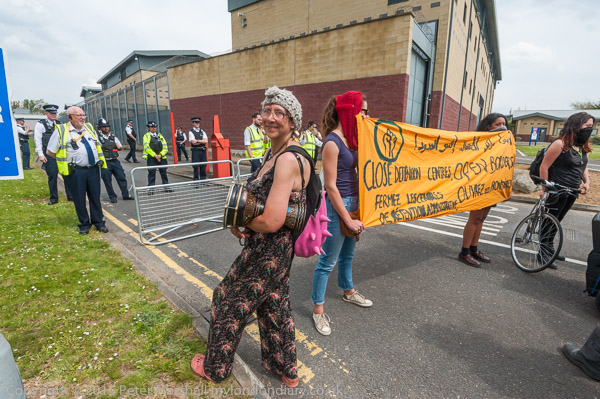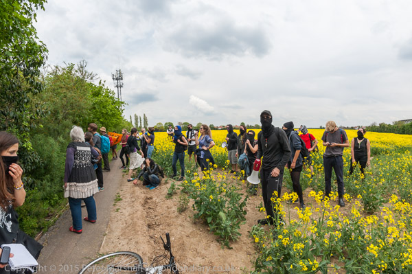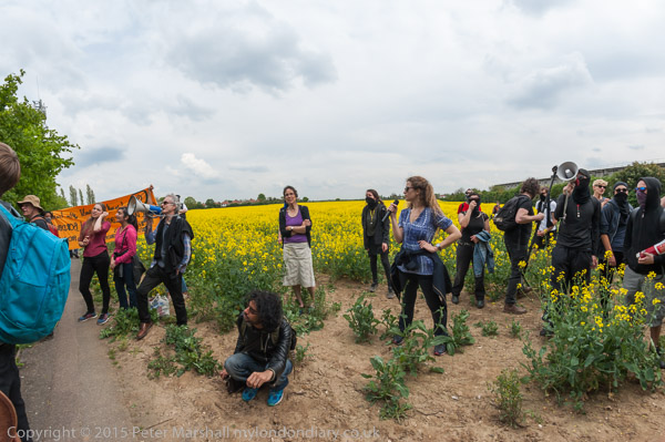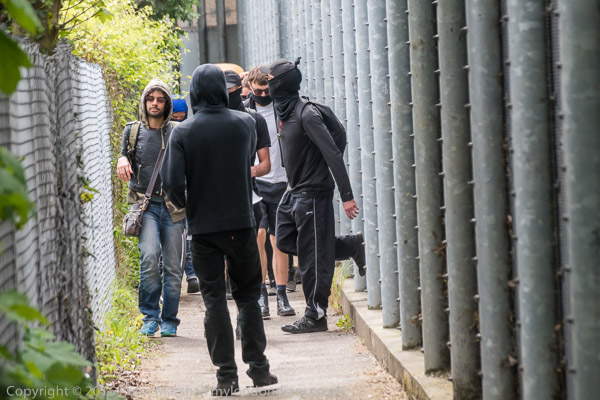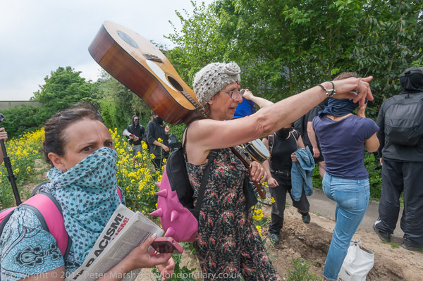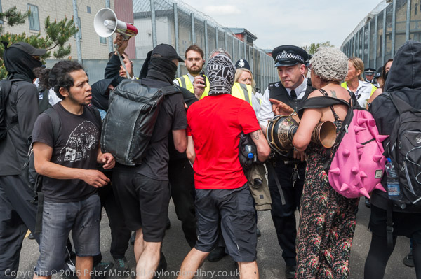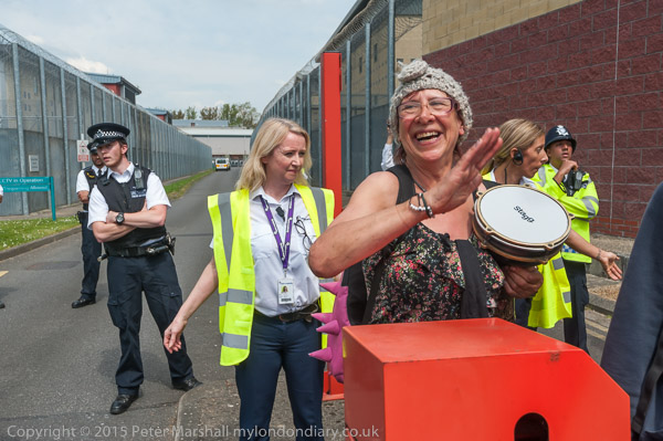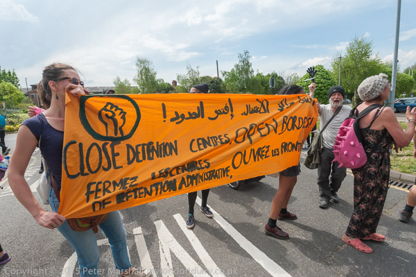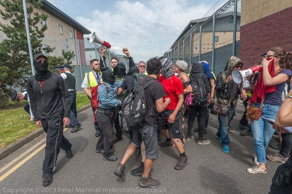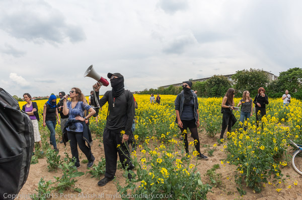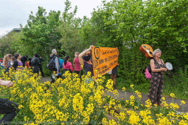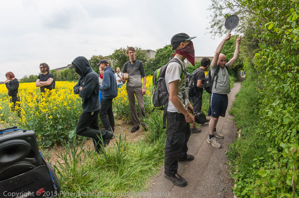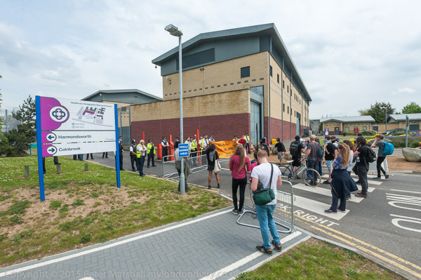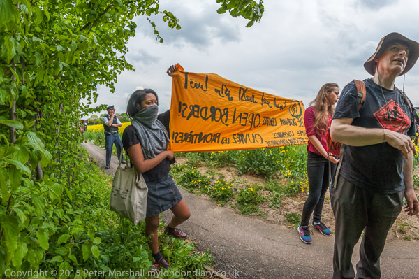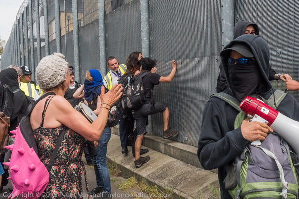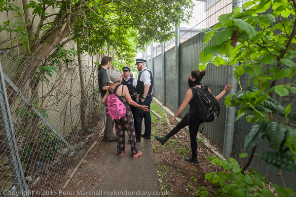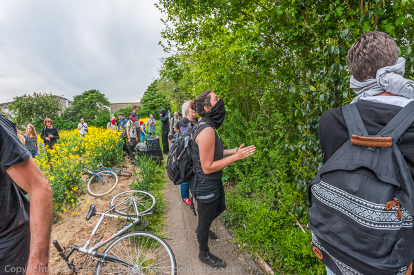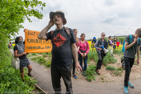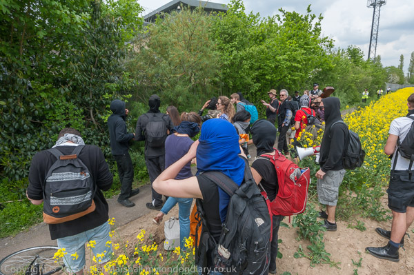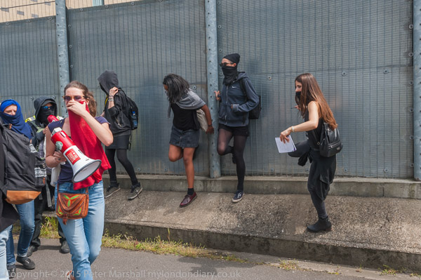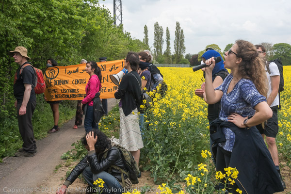 The protesters decide to go down the public footpath beside the COlnbrook prison to get closer to the prisoners held there