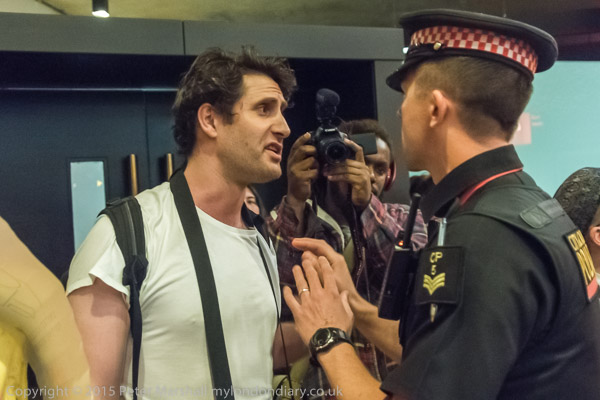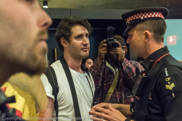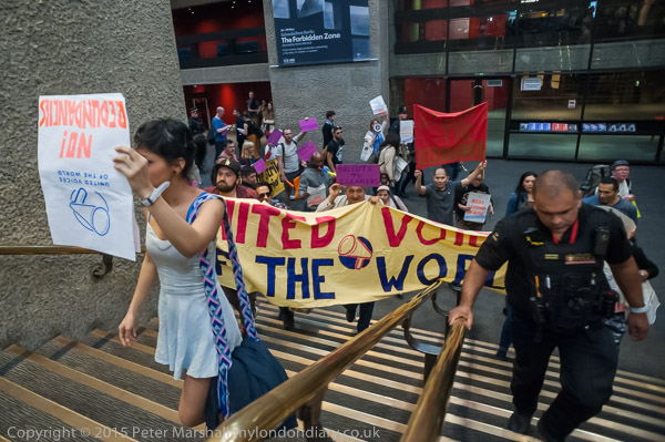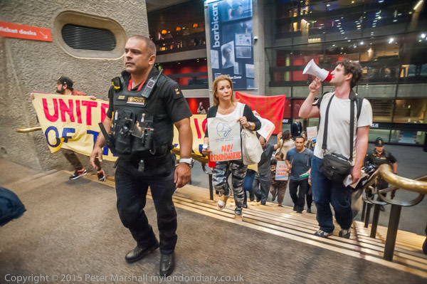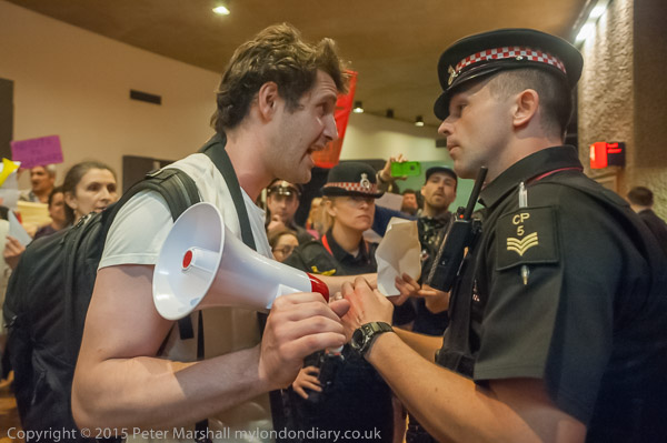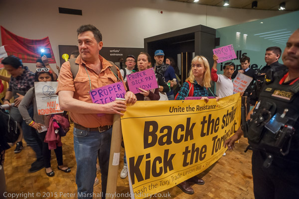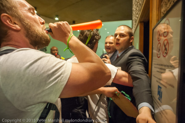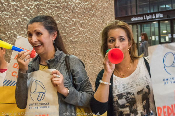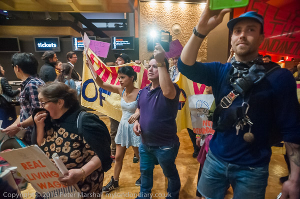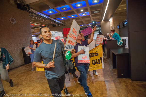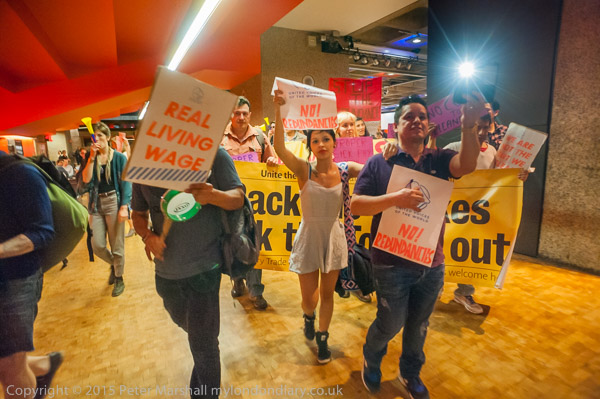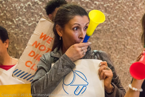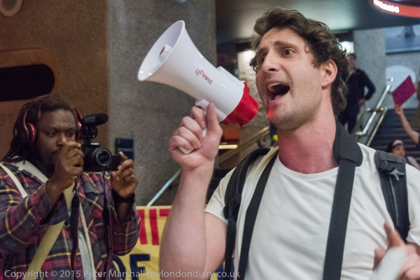 An UVW General Secretary Petros Elia speaks against cutting the cleaners jobs to the people waiting to go in to the concert