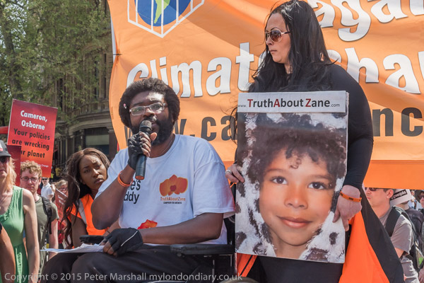 ![]() Green Party leader Natalie Bennett, who spoke later in the event ![]() A woman whose home was flooded in York speaks about her experience ![]() 'Cameron, Osborne, Your policies are wrecking our planet' ![]() Kye Gbangbola, father of Zane Gbangbola, killed in the 2014 floods, is supported by Zane's mother, Nicola Lawler ![]() as he tells the story of the death and cover ups by the authorities. Their campaign to get at the truth needs support, particularly now as they have been refused legal aid for the inquest. ![]() John Stewart and other 'No third runway' campaigners march backwards ![]() ![]() 'Save Our Green Earth' says a hand-embroidered placard ![]() 'No to fracking - Climate jobs now' ![]() Mermaids for Climate Change |
