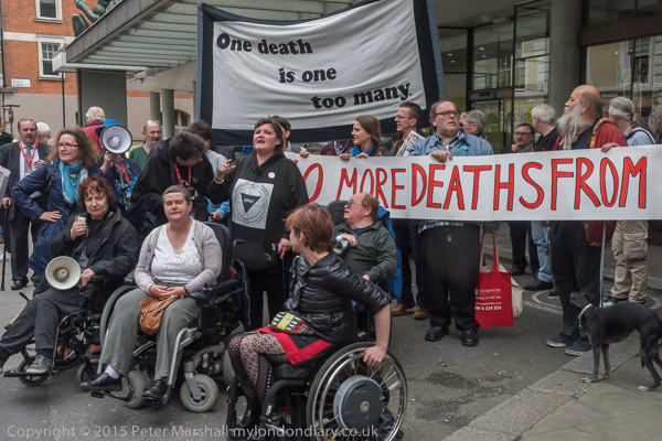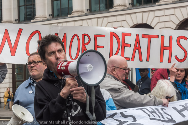 in front of Congress House with banners 'No More Deaths from Benefit Cuts'. Among them were activists from