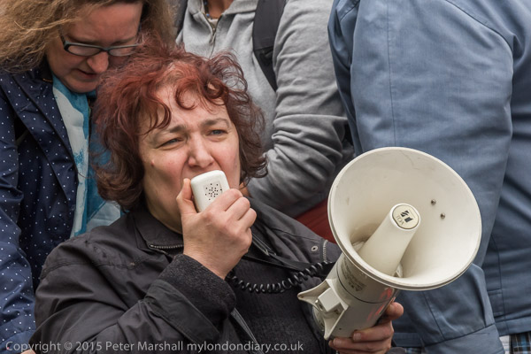 A woman speaks and points at the banner listing just a few of those know to have died because of sanctions and cuts