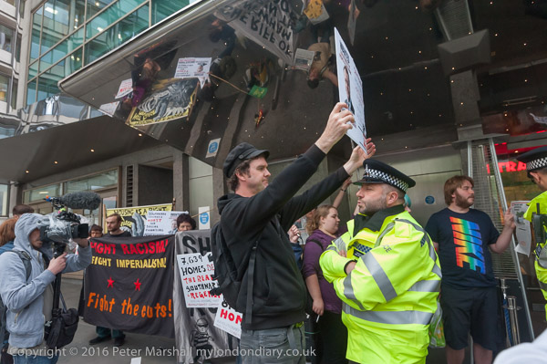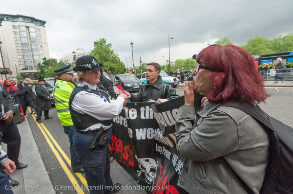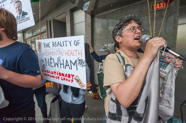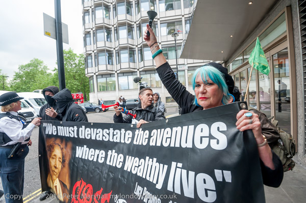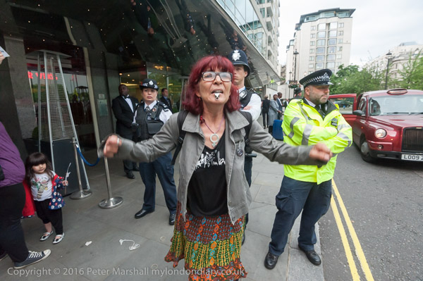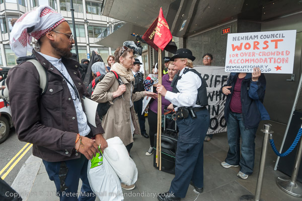 A protester from the Aylesbury Estate jumps up and down blowing her whistle after she has been thrown out of the Hilton Hotel