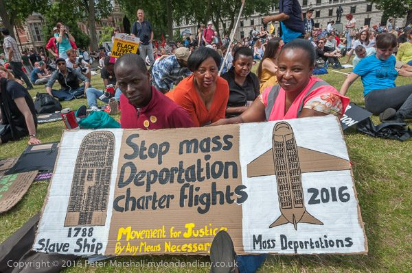 'Stop Mass Deportation charter flights' - a poster compares them with a slave ship