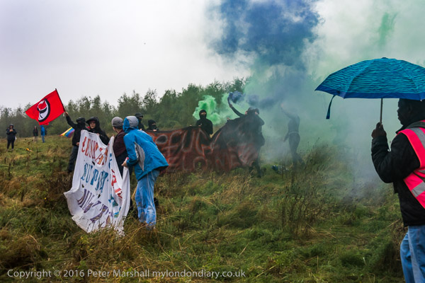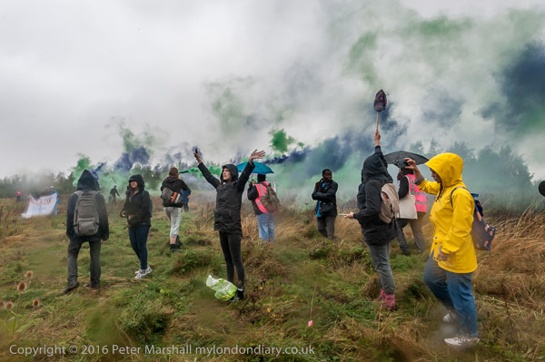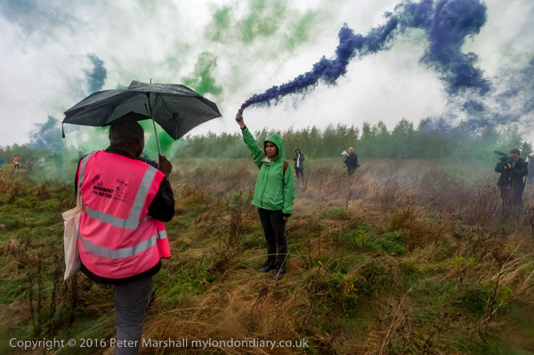 Sisters Uncut and others set off flares on the hill facing Yarl's Wood immigratin prison
