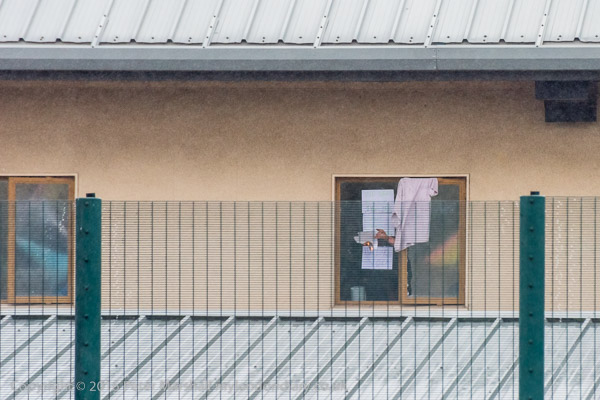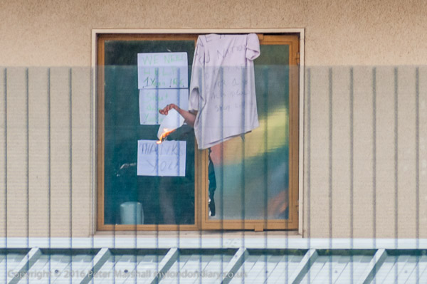 A woman inside sets fire to sheets of paper and throws them out of the window