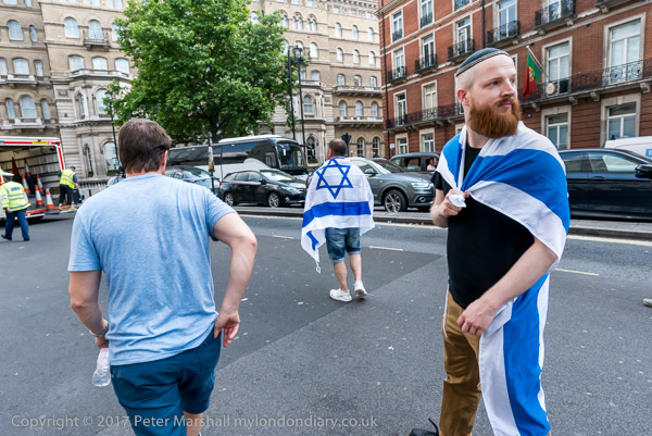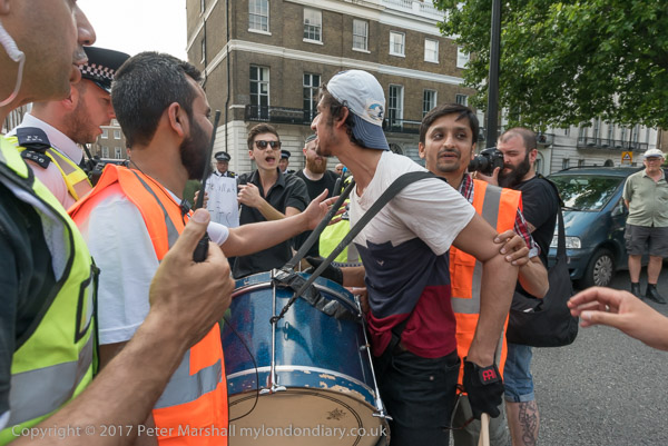 Stewards hold back a drummer who tries to go and argue with the Zionists