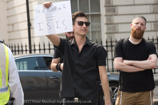 One man holds a poster 'Hezbollah = ISIS', a seriously deranged view