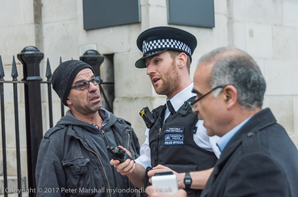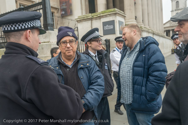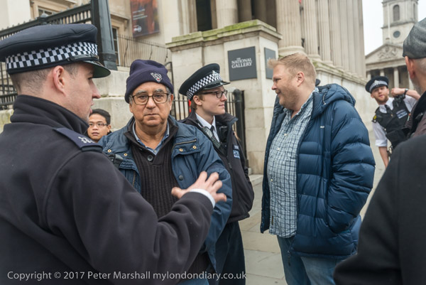 One of the protesters talks with police about the racist comments