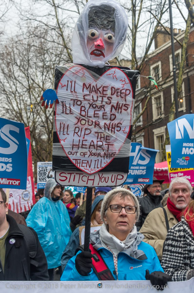 A Theresa May placard 'I'll make deep cuts to your NHS, I'll Bleed Your