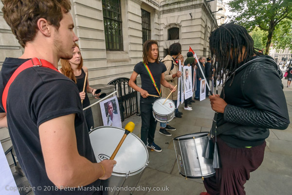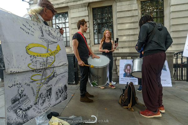 The protest starts with some drumming and people holding posters of