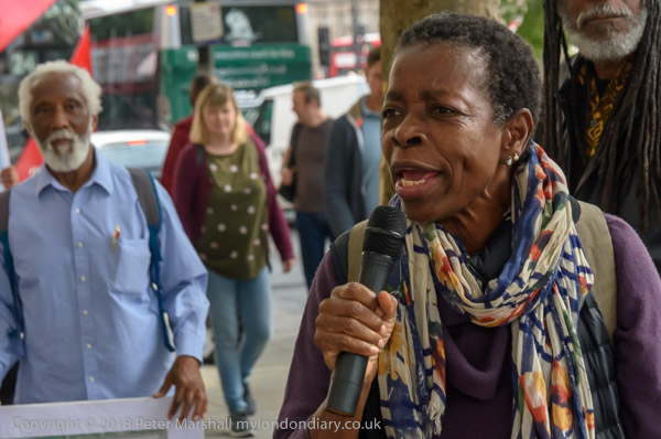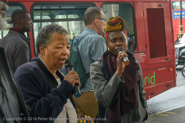 People read the name of one of the murdered strikers then take flower to lay in his memory Flowers and portriats of the murdered miners on the locked gates of South Africa House0 The protest ends